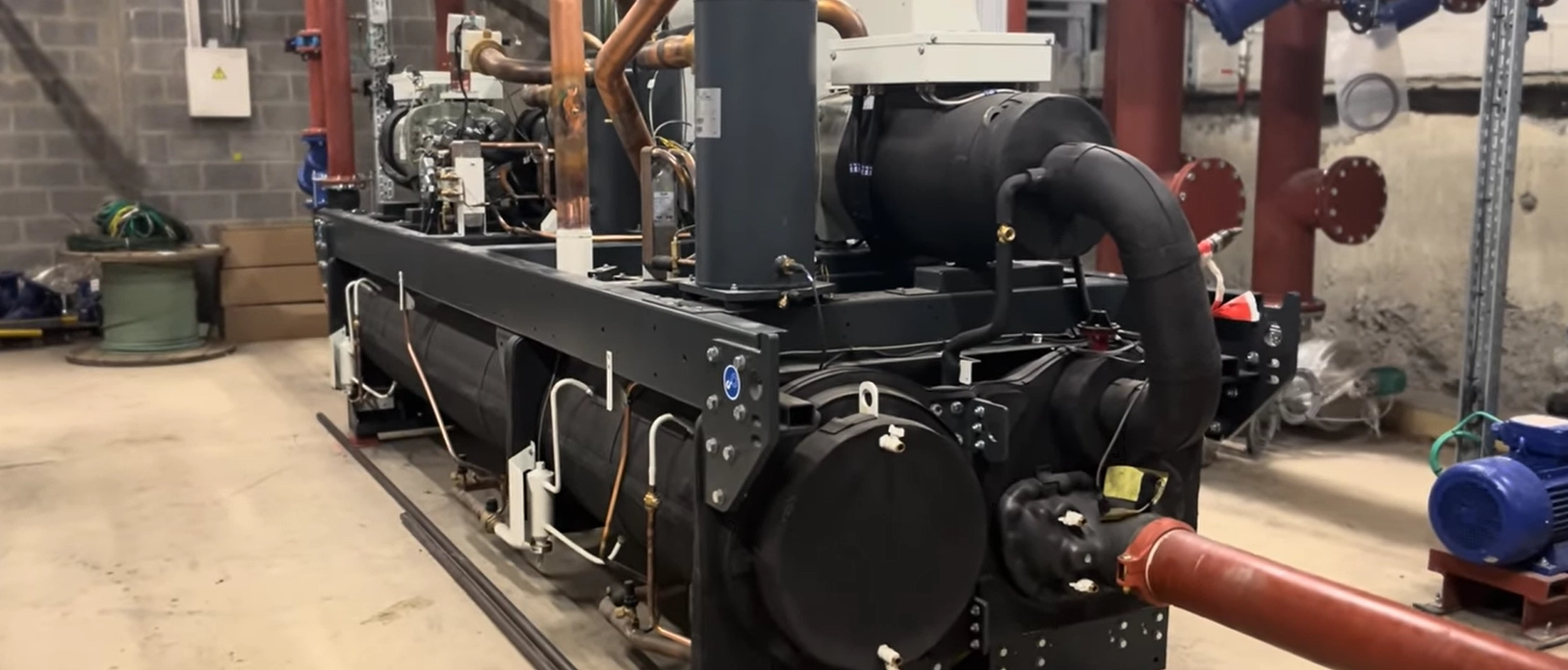 Les voici : nos deux pompes à chaleur eau-eau. Ces installations sont quatre fois plus efficaces que les chaudières à gaz classiques. Grâce à cette installation, nous verrons disparaître notre facture de gaz avec une économie de 150.000 € par an. Nos émissions de CO₂ diminueront de 361 tonnes par an. Cela correspond aux émissions de 120 ménages en Belgique.